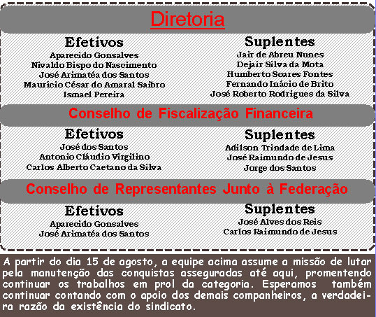 Meus amigos, gostaria que vocês cobrassem deles alguma decisão que lhes fosse favorável em qualquer estância nos fóruns da região. Quando dizem que ganharam alguma coisa, acreditamos que este “bando” de espertalhões de época devam até estar levando um “por fora” de alguns patrões. Isto é o que se comentam. Além disso, sabemos também que alguns sindicatos filiados à CUT têm interesse em abocanhar esta categoria. Na verdade, o que eles pretendem é vender a nossa categoria e entregar a nossa entidade nas mãos destes famigerados, que pensam que têm capacidade para representar esta aguerrida classe.