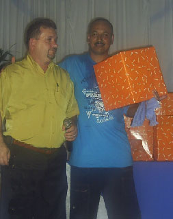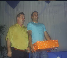 Ponto auto da festa, vigilantes sócios vibram ao serem sorteados e recebem a premiação das mãos do presidente, Aparecido Gonsalves. |
